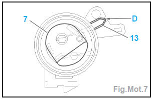 Impératif : l'index (13) doit dépasser l'encoche (D) d'une valeur angulaire d'au moins 10 (dans le cas contraire : remplacer le galet tendeur ou l'ensemble courroie distribution et galet tendeur).